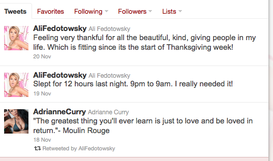 Ali also remained relatively silent on the Twitter front. Her last few tweets (see below) could be referencing the break-up, but looks like they’re keeping it hush-hush. The couple’s rep released the following statement, “Ali Fedotowsky and Roberto Martinez have ended their relationship. As they go through this difficult time, we ask that you respect the couple’s privacy.” …Good luck with that.