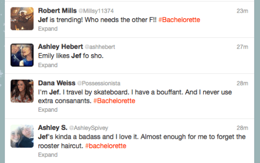 Jef – Cool, confident, trending on Twitter (see below). CEO of a company, involved with charity work. Rode in on a skateboard Back-to-the-Future style.