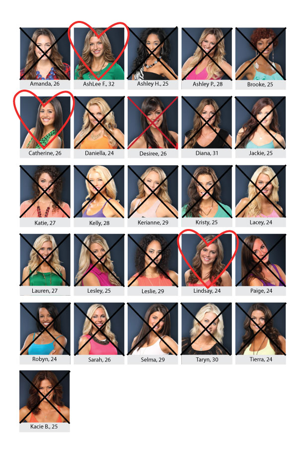 Who got kicked off and who made it to the fantasy dates: Poor Desiree. Good news: she didn’t really have a boyfriend. She hired some actor to get back at Sean for the prank he pulled on her. Bad news: Her brother ruined her chances with Sean. After Desiree’s brother insulted Sean’s character/integrity by calling him a “playboy,” claiming Sean wasn’t interested in Desiree, and then proceeding to badger Sean the rest of the night, I don’t think Sean was ready to marry in to that. I mean who could blame him. Sure, the rest of her family seemed splendid, but who wants to have a brother-in-law you can’t stand? And so the last 3 lucky ladies making it to the Fantasy Suite dates are (drumroll please) Lindsay, AshLee, and Catherine. Who woulda thunk it – the teacher who dressed up in a wedding gown and got sloshed the first night, the professional organizer, and the graphic designer that flew relatively under the radar.