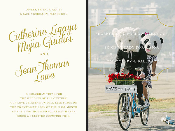 The wedding invite: Quirky like the couple. Possibly done/influenced by Catherine’s graphic design background? The wedding invitations were designed by Smitten on Paper, and included the punny phrase: “The LOWEdown on marrying, eating, boogie-ing all night long.
