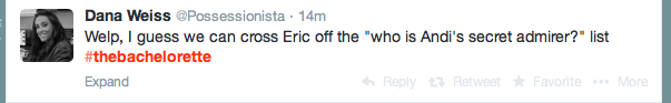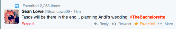 Cocktail Party: At the cocktail party Tasos immediately stepped up to get some one-on-one time with Andi. And then stepped right on home. Sean Lowe (The Bachelor from 2 seasons ago and now married to Catherine Giudici) had a pretty great tweet in regards to Tasos being eliminated at the rose ceremony (see below).