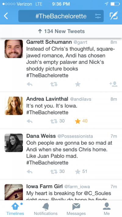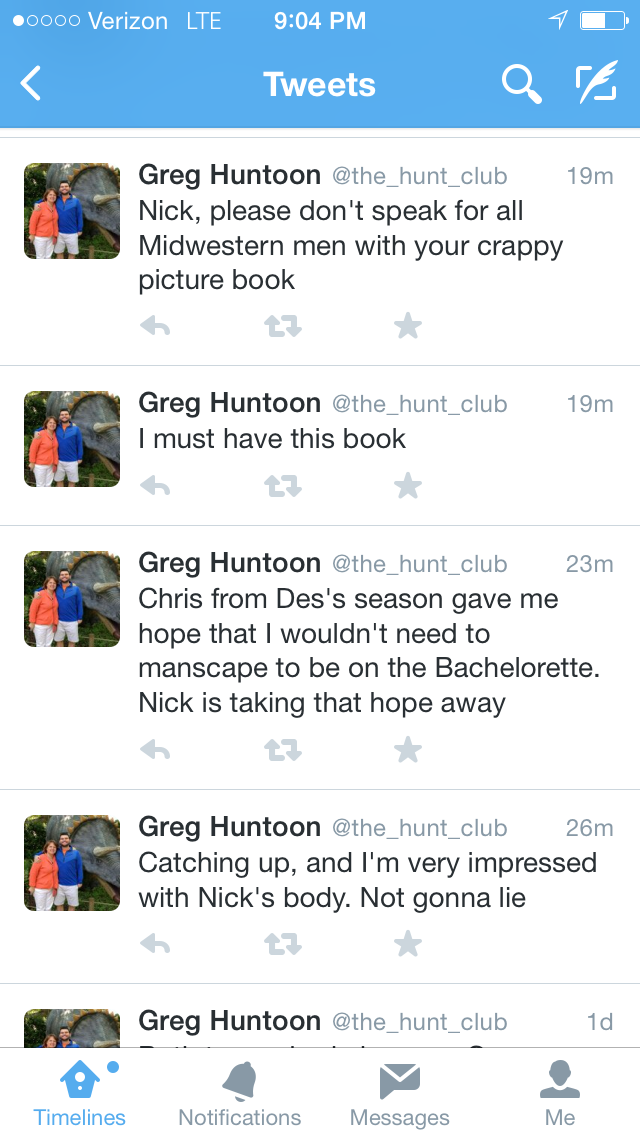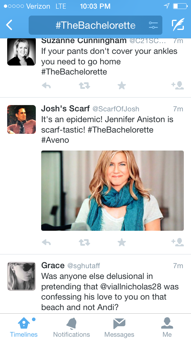 Parody Twitter Accounts: Discovered this gem: A Josh’s Scarf Twitter handle, called @ScarfofJosh. If you’ll remember we had Ben Flajnik’s hair (@BenFlajniksHair), Sean Lowe’s abs (@SeanLowesAbs), and Tierra’s eyebrow (@TierrasEyebrow) from seasons past.