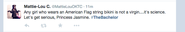 Meanwhile back at the lake, Kaitlyn got the rose and promptly announced “And I’m drunk,” and Jasmine got it on in the tent with Chris. She told him she’s inexperienced and alluded to the fact she is a virgin but didn’t say it outright.
