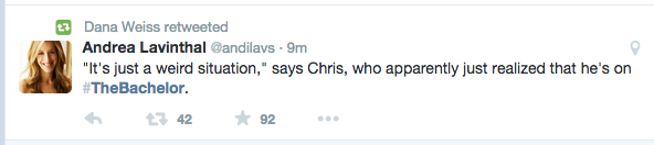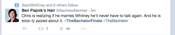Tweets of the Night: I was excited to see parody accounts @BenFlajniksHair and @ScarfofJosh back on the Twittosphere live tweeting #TheBachelorFinale.