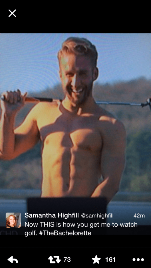 I love these love analogies. Every season we get to hear how love is like an airplane or a bull fighting ring or deep and wide like the ocean. THIS season Shawn B. opened our eyes to how love is like golf: “It’s something you can do when you’re old and gray.” Yes, yes it is something you can do when you’re old and gray… Anyway, if you hadn’t picked up on that yet, Shawn B. and Kaitlyn went golfing. They were all kinds of flirtatious. They got into a bet where Shawn B. had to sink a putt completely naked, earning him his first black box on national television. Kaitlyn stole his clothes while he was golfing and this is where that magical, crafty editing skills of the ABC producers come in. Shawn B. ran after her and that was the scene they used to cut and overlay with Kaitlyn’s passionate gasps when she was with Nick.