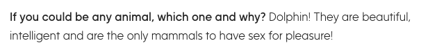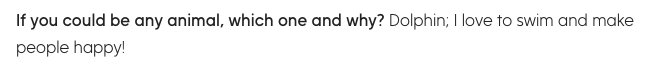 Two people also picked the dolphin as their animal of choice. One for a very different reason than the other…Lauren “LB” vs Jennifer. Or maybe they both kind of line up.