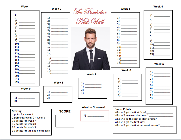 **UPDATED (1/2/17): Bachelor Bracket has been updated: Week one added 3 ladies (taking it up to 22 ladies), Week two added 2 ladies (making 18 ladies), Week three added 2 ladies, Week four added 2 ladies, Week five added 1 lady. If you started playing this means you get to add some more ladies to your brackets and since you had to whittle it down early you already know your true frontrunners. My sincerest apologies, I will drink a glass of wine as penance.