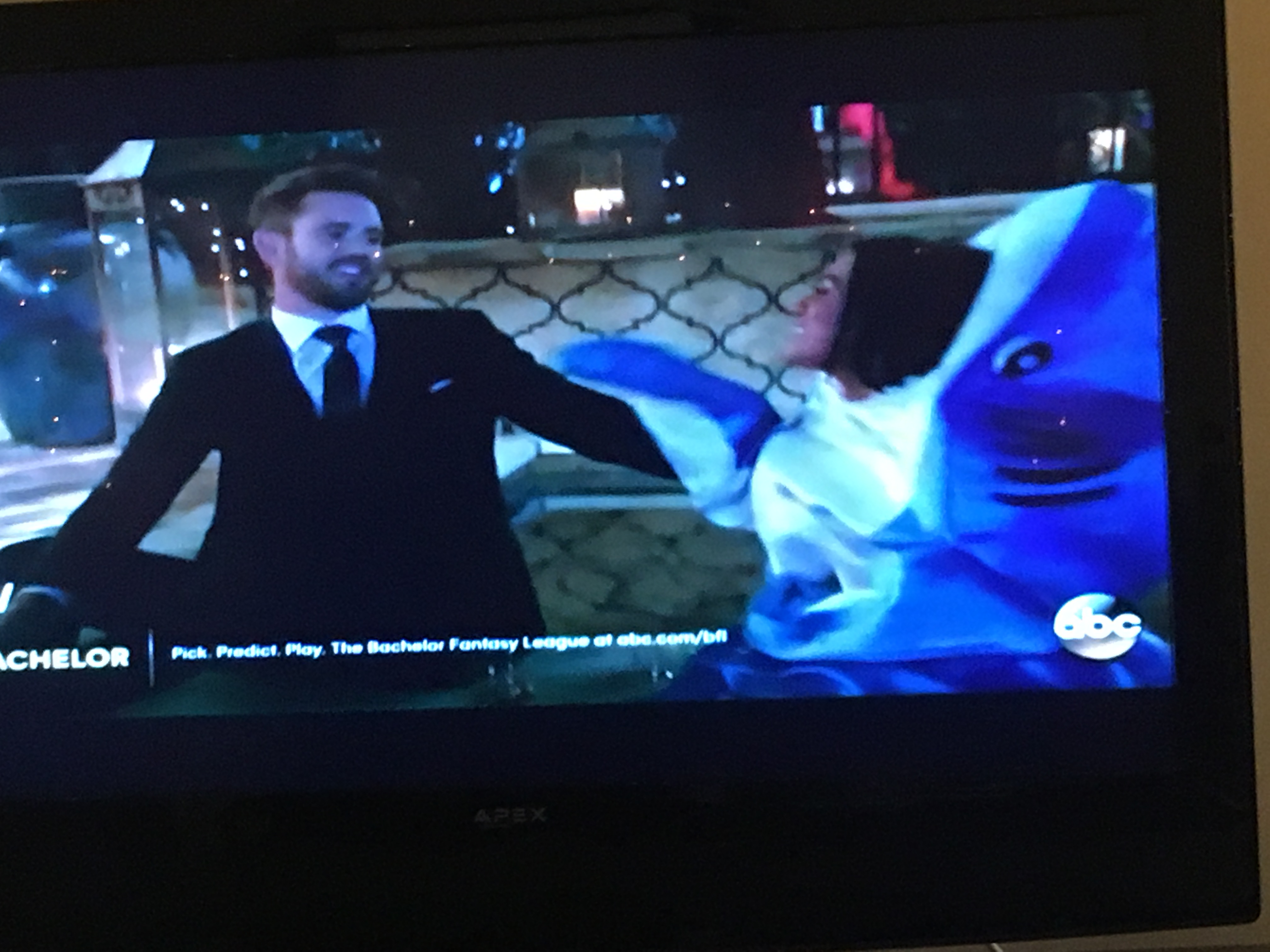 Hailey standing next to Alexis in the Dolphinark costume during the rose ceremony: “If I don’t get a rose tonight, I’d be hugging a f** dolphin.” It’s a shark, Hailey. Left Shark.