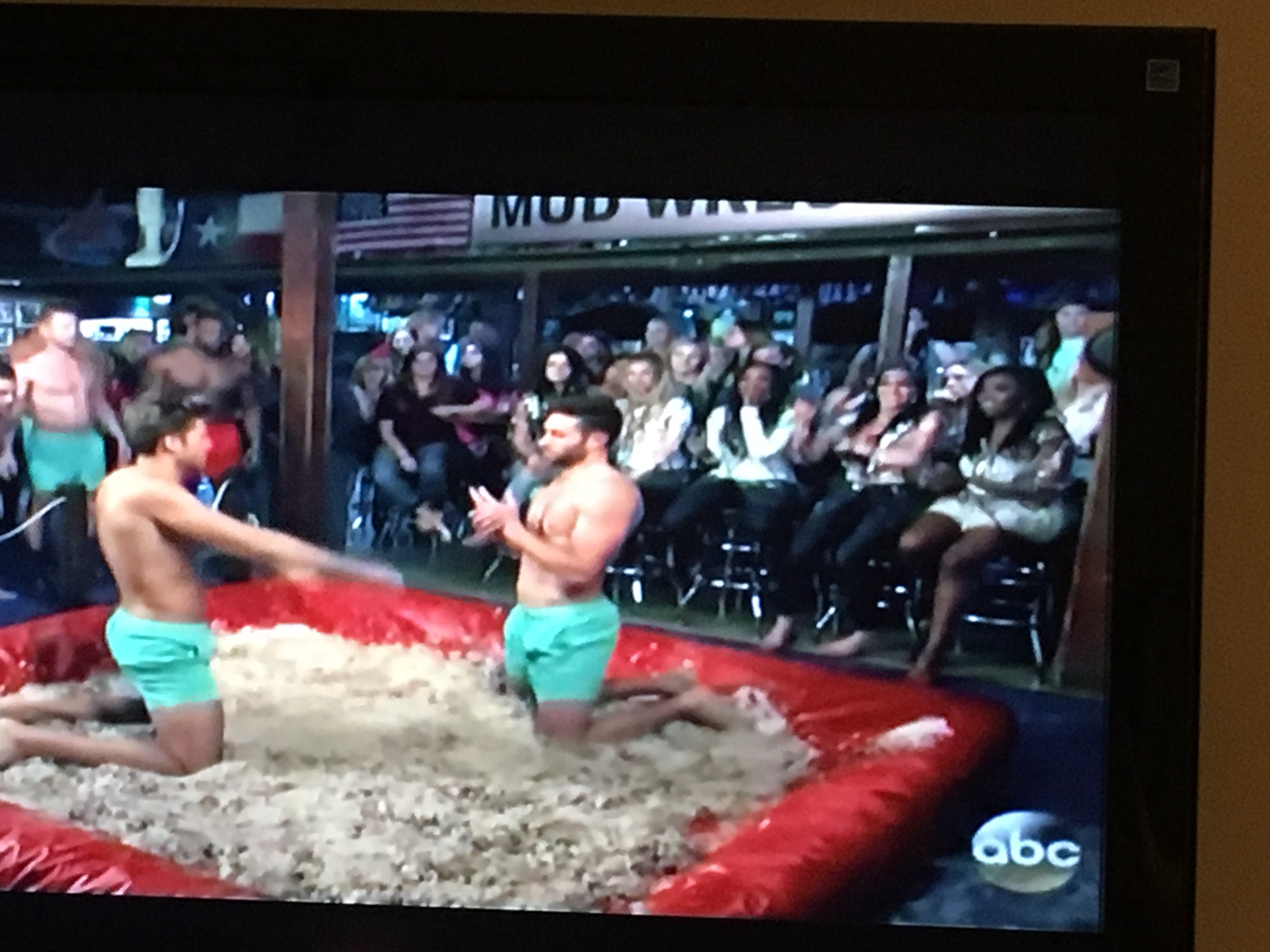 Shirtless Men. Mud Wrestling. Someone peed in the Bachelor Pool. And someone else is rolling boogers. And they’re single, ladies. Let’s not all jump at them at once.