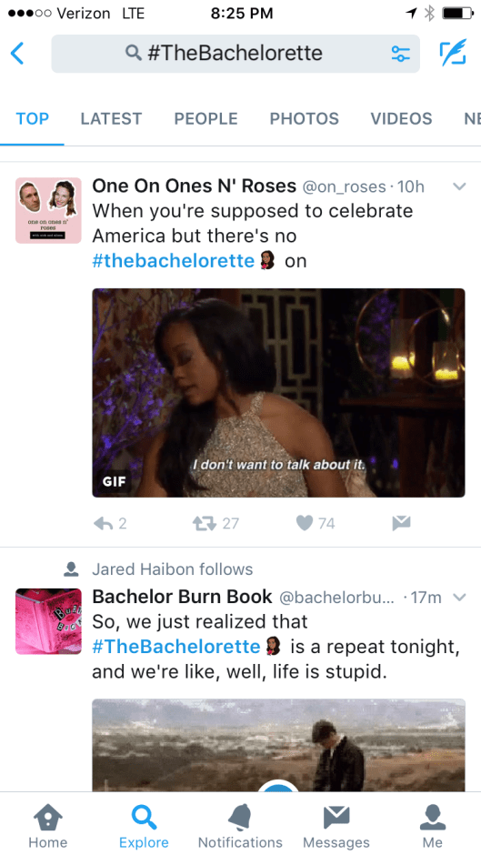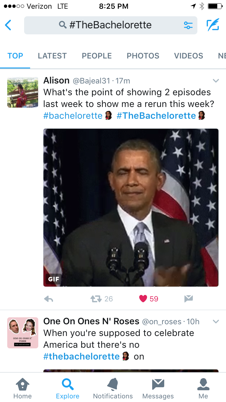 I decided against a few more laps in the pool and felt alright about it, hustled on home on the T, and turned on the TV to see Josiah talking to Matt. Confused I relooked at the TV guide about 10 times. It couldn’t be. Then I saw the word above the episode: Repeat. Alert! Tonight’s a repeat Bachelor Fans! If you haven’t already tuned in. I sincerely apologize from the bottom of my heart for not digging through the trenches of the TV guide to make them tell us this most important news. Thankfully, the Twitter does not disappoint. Bachelor Fans made it all feel alright. Enjoy the Fourth! And these firework tweets from Bachelor Nation.