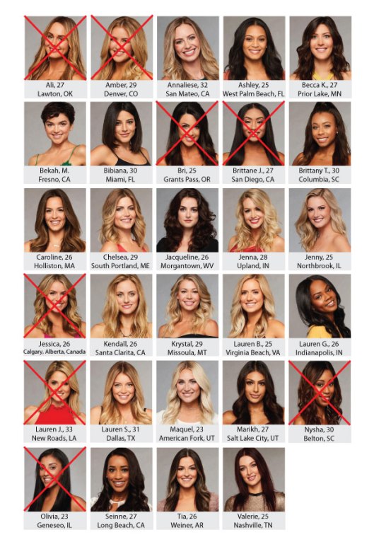 Who got kicked off: Ali, Amber, Bri, Brittane J., Jessica, Lauren J., Nysha, Olivia were all the girls we will never know kicked off night one.