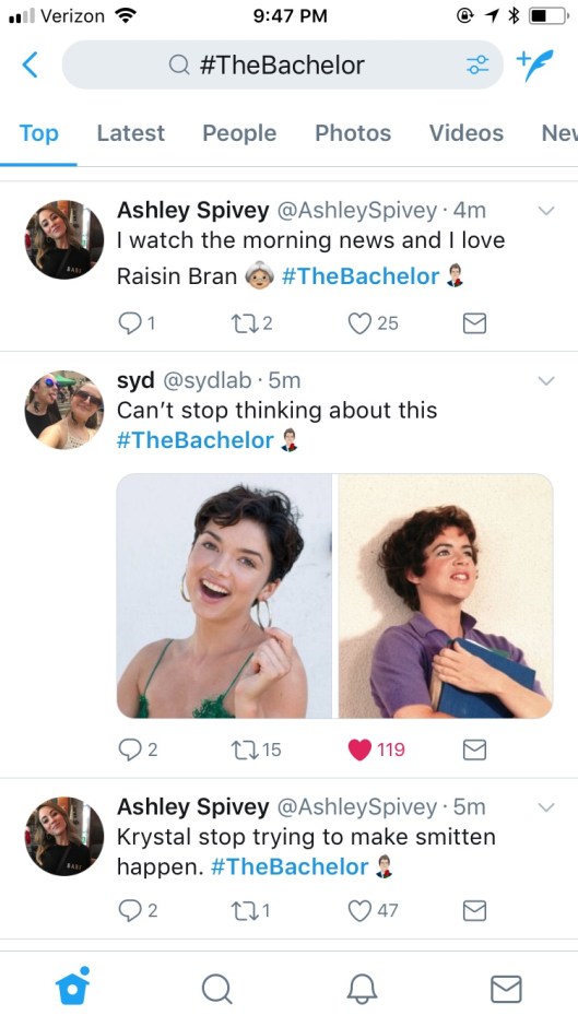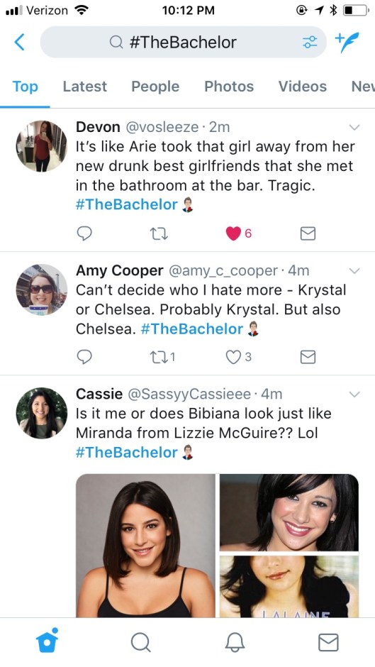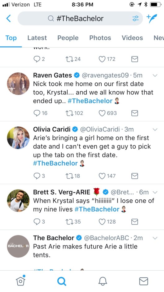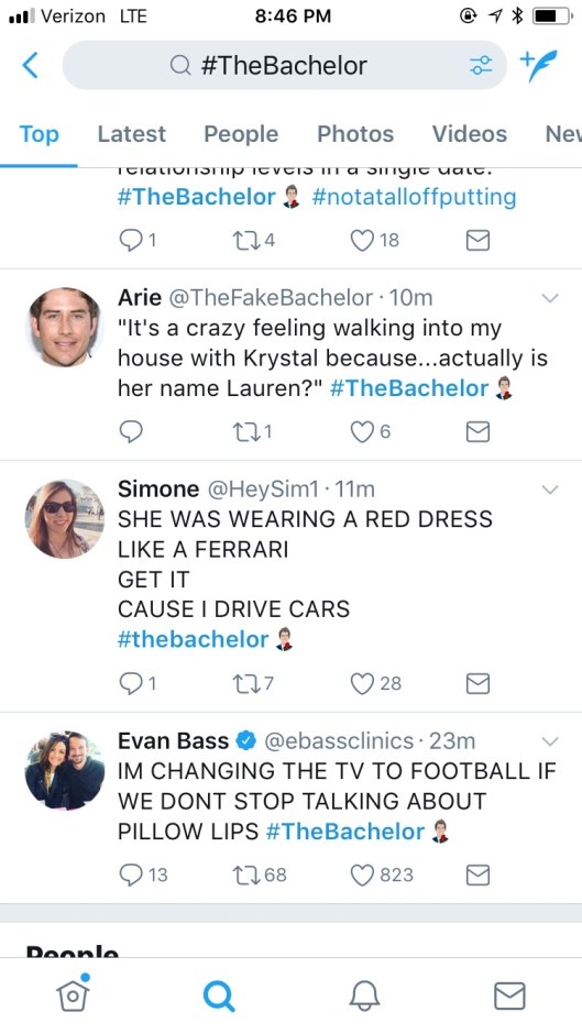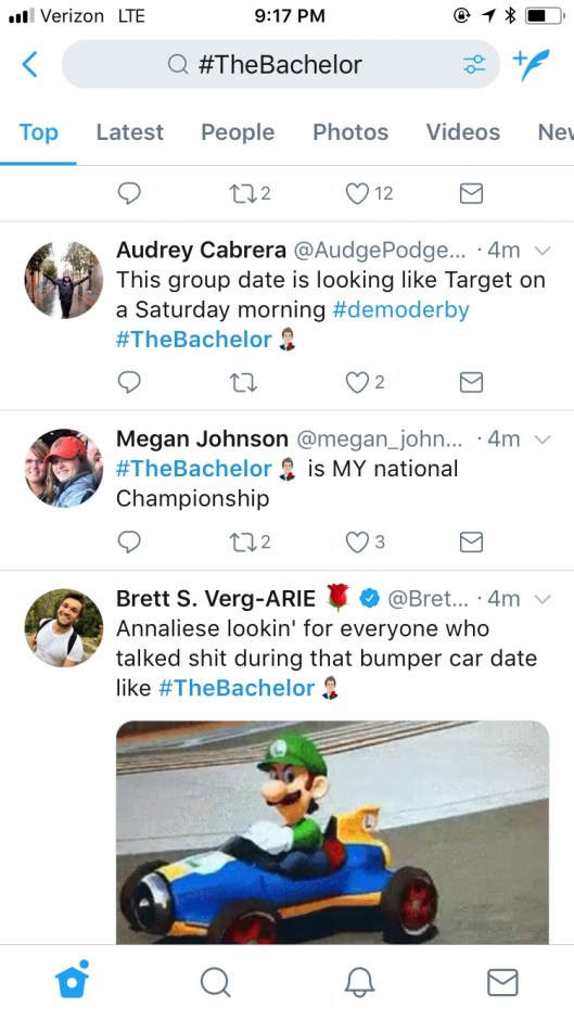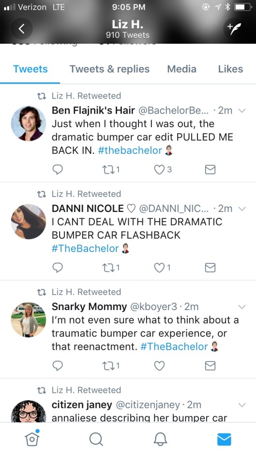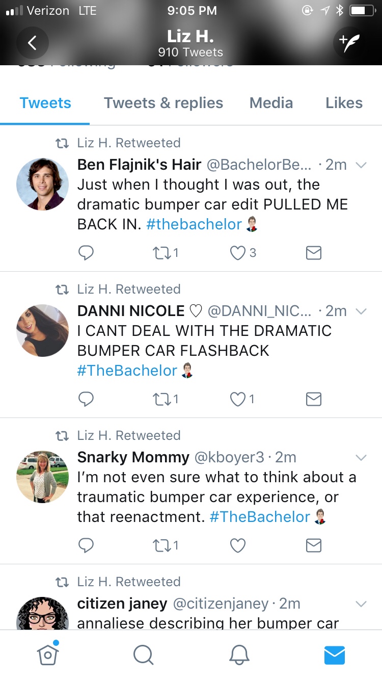 We’re off to the races. Becca got the first date. Krystal got a rose and went straight to meet the parents. 15 ladies went on the group date and played adult-sized bumper cars. Krystal revealed she had a tough life growing up and her brother was homeless. Annaliese revealed she doesn’t like bumper cars. I’d like to upfront apologize to all those out there that have also had bumper car trauma and or have been hurt having to be subjected to the phrase “pillow lips.” Twitter was very unkind to you.