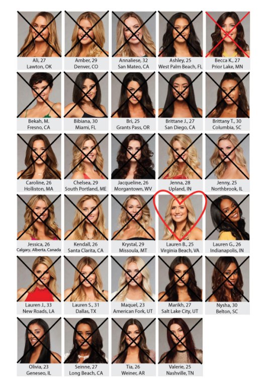Who got kicked off: Lauren, JK Becca. Arie proposed to Becca. Dumped Becca. Went back to Lauren. And proposed to Lauren. And Becca is the new Bachelorette. Got all that?