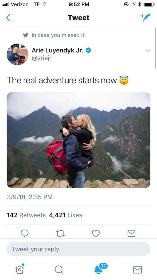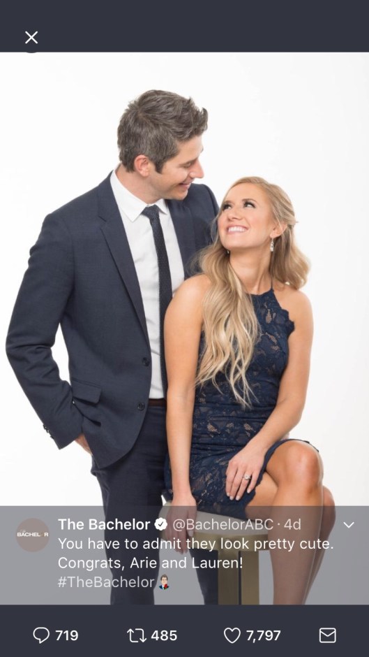 After After the Final Rose. Arie and Lauren are living it up on Twitter. So much for staying off of social media. That boils my blood. Where’s the wine fund?! They look happy in love, though and took Jason and Molly Mesnick’s advice and got the heck outta dodge.