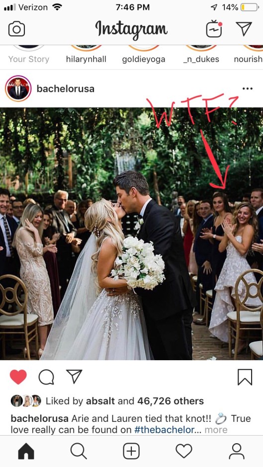 I definitely dress shamed the lady in the background. You don’t wear white to a wedding people! But then again, I suppose all of her bridesmaids wore white too and I do not think Lauren cared. Twitter let me know that that lady is actually Lauren Luyendyk’s wedding gown designer Hayley Paige. Fun! US Magazine has all the photos. As do Arie’s Instagram and Lauren’s Instagram. They are happily “Maui’ed” as their matching in-love honeymoon shirts proclaim.