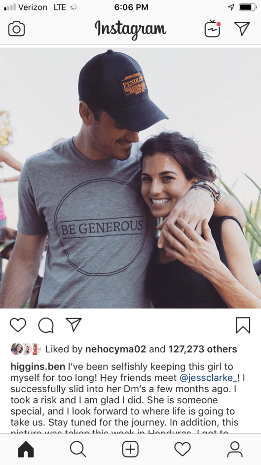 Ben Higgins made it Instagram official today. He is dating a lucky lady named Jess Clarke. They went on a trip to Honduras together for Generous Coffee. She is from Nashville and they’re indicating that you’ll see a lot more of Ben Higgins in Nashville.