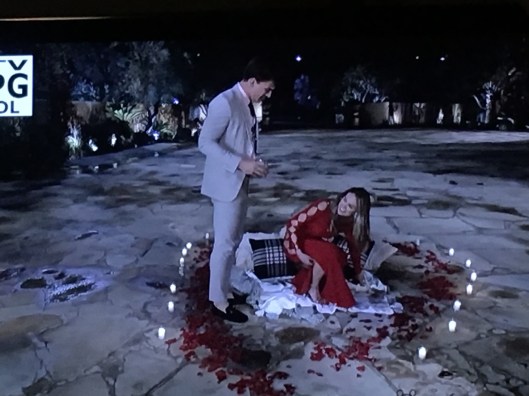 After the rose ceremony was over, Luke P. called out good-night and sneakily slipped into the room Hannah Beast was in for her interview with the producers. Hannah got flustered and didn’t know what to do and where to go to talk. Luke P. offered his lap. Hannah B. confessed her concerns that it was happening so soon for him to be falling in love.