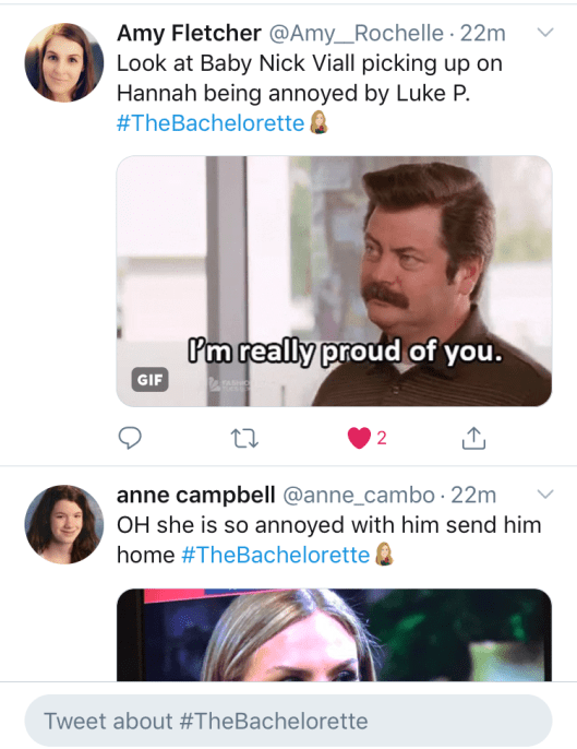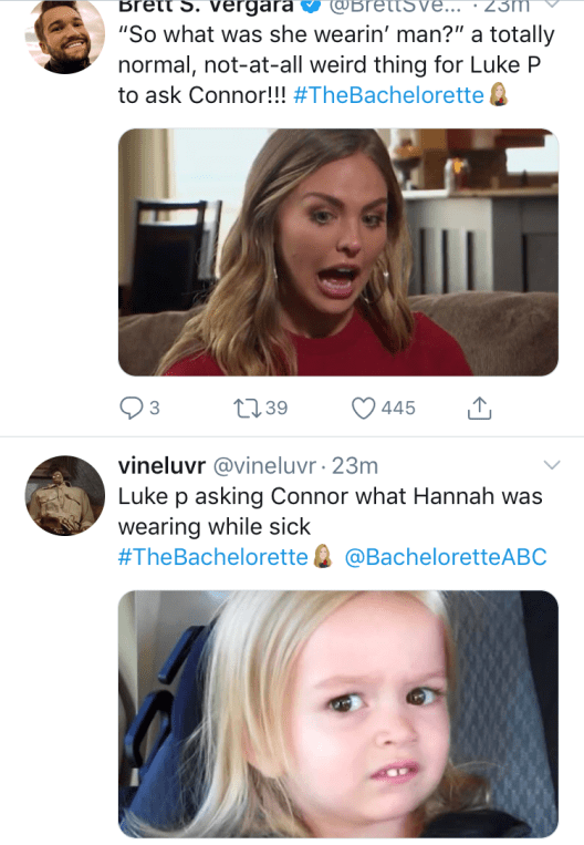 And Luke P. was like nooope, I’m gonna pretend like that conversation never happened. Red Flags. Big Bright Alabama Crimson Red Flags are flying high, Hannah B. Luke P. tried to get more time because he said she mostly just talked at him and he didn’t get to say anything. He got visibly steamed and heated and at Peter the Pilot no less, when Peter was just trying to talk to her because he hadn’t at all that night. Oh, Luke P. you are going down.