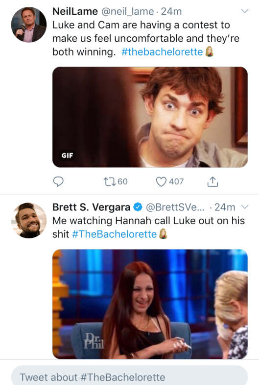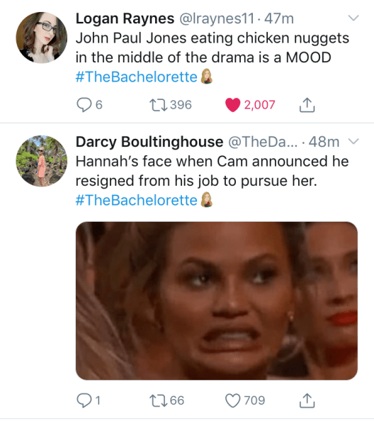 That’s Southern talk for best be watching out, Luke P. Hannah B. is calling the shots. Tyler C. is MVP of this round with his strong woman compliments. John Paul Jones has the best reactions and will solve disputes with chicken nuggets. Hannah B. had a sit-down with Luke P. and Cam.