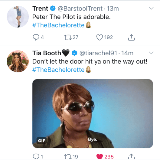 That’s when Peter the Pilot swooped. See what I did there. Peter the Pilot told her that his mom was a pageant queen too. Miss Illinois. He also shared that his mom and dad met on a flight, his dad a pilot and his mom a stewardess. His mom saw his dad’s booty and said that’s the man I’m going to marry. What a meet-cute. Peter the Pilot took Hannah B. out to the courtyard and they had a hot make-out session in her cute, tiny, sparkly, black romper.