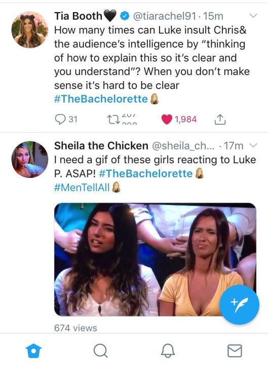 The Men Tell All brought out chicken nuggets, Hannah B. and the men. Luke P. took most of the show and then cut out early to “catch a flight.” He basically just said his peace to control his messaging (which made no sense mind you) and skeedaddled. Good-bye forever. Hannah B. apologized to America for having him on the screen for so long and hoped that it would help others get out of toxic relationships. Seeing the good in the bad.