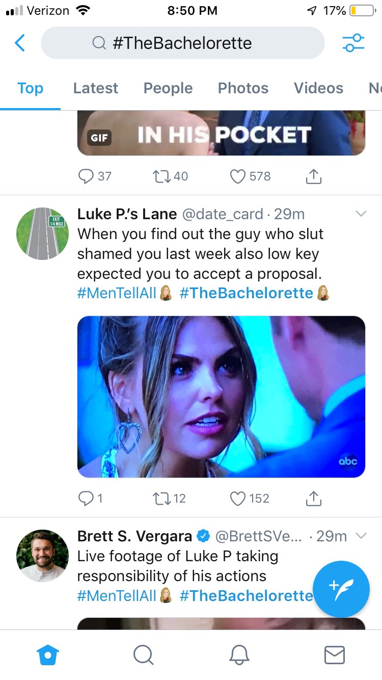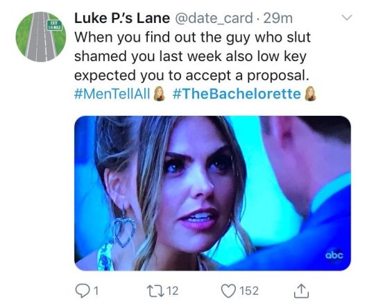 Luke P. had the balls or just the total lack of self-awareness to show up to Men Tell All. He was in the hot seat with Chris Harrison for what felt like an eternity with all of the extremely long pauses, where after Chris Harrison asked him a question, Luke would stare off into the distance and then tell Chris Harrison he didn’t want to be misunderstood. Chris Harrison called out one of his farces, by showing Luke that Luke said two contradictory items – that he would opt out of the show if he found out Hannah had slept with someone and then he refused to leave. It makes no sense. Luke P. makes no sense. Chris Harrison also asked him if he had any regrets or things that he would have done differently on the show, and Luke P. straight up said “No.” Sooo, there you go. That shit cray. Hannah B. said her faith was what connected her to Luke P. and in the end that’s what was “weaponized” against her. Truth.