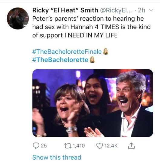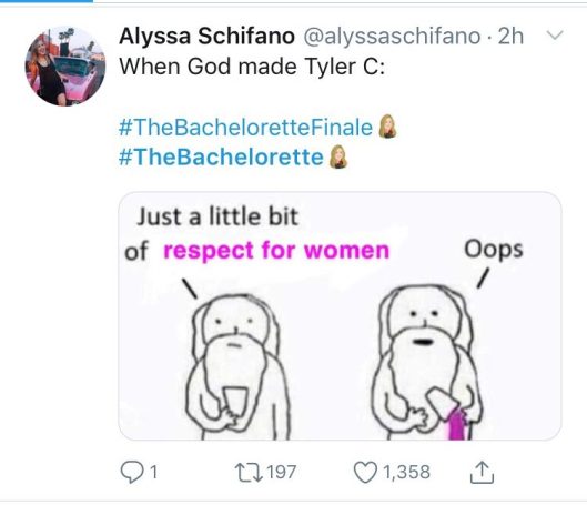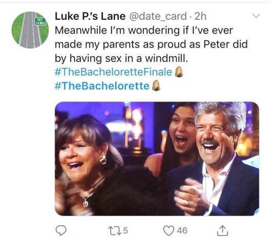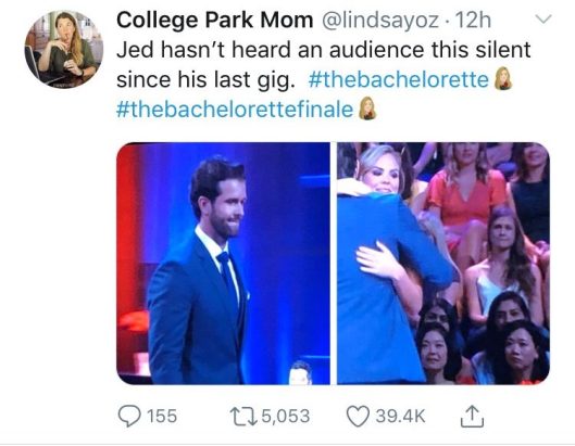 Hannah B. first said good-bye to Peter the Pilot (who flies for Delta btdubs, so book those tickets now! And look at how cutely supportive Delta was of him on Twitter.) at the rose ceremony, which left Tyler C. and Jed to meet the parents. Peter the Pilot was heartbroken and looking good at the After the Final Rose when he had to see Hannah Beast for the first time since the break up. Hannah Beast was acting like a single lady when she let the audience know that they didn’t just do it twice in the windmill. Ohhh, au contraire, mon frère. Peter and Hannah B. did it 4 times! 4 TIMES IN THE WINDMILL. So Hannah gave him big props.