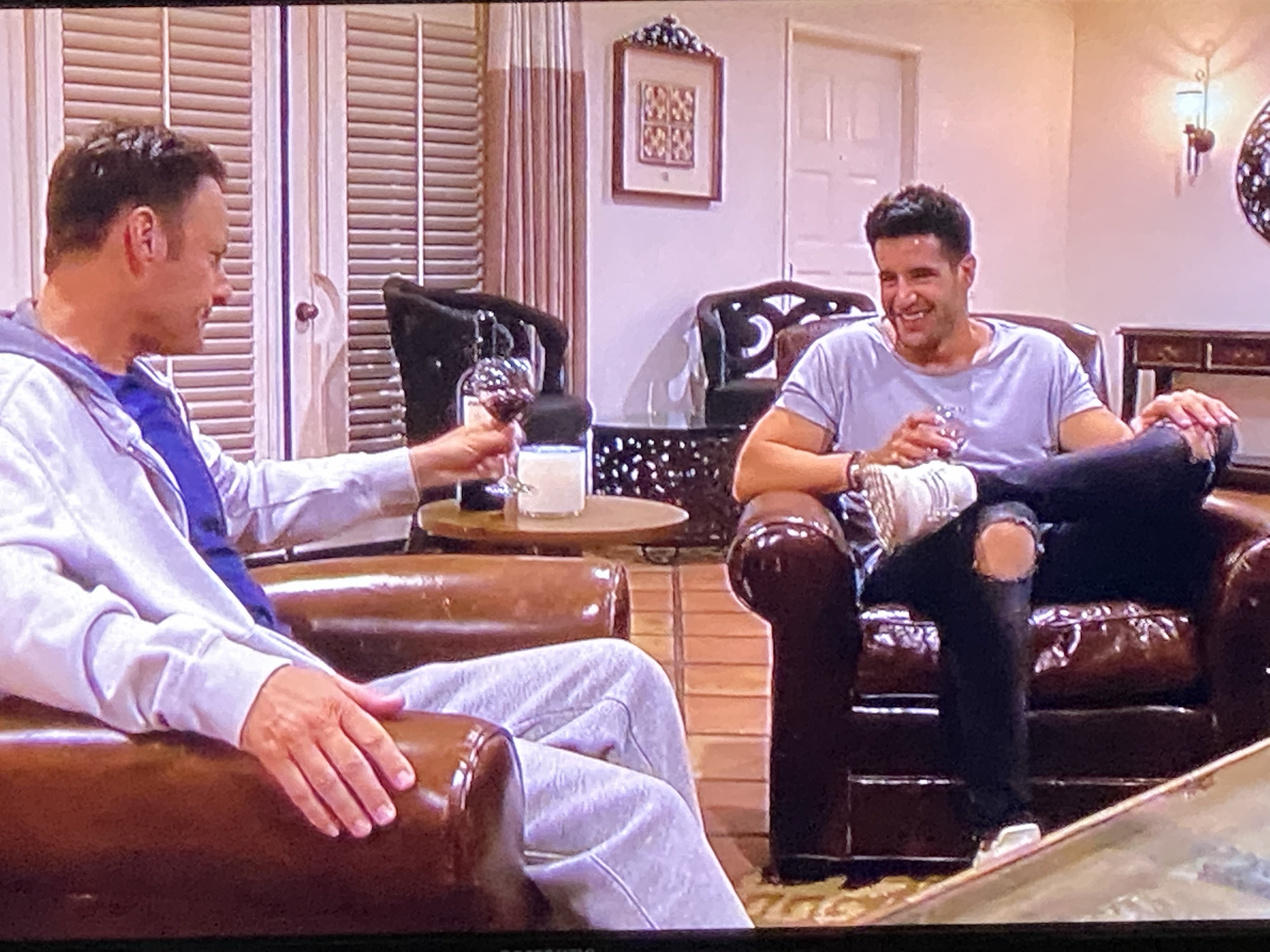 The best producer stunt ever. Ed went along with it. It was great. Both Ed and Ben had the idea to go to Tayshia’s suite. Ed got the wrong address and showed up at Chris Harrison’s suite. Ed looked so confused when Chris Harrison answered the door. Chris asked him what he was doing and then invited him in for a nightcap. Ed perked up at the idea of a drink.