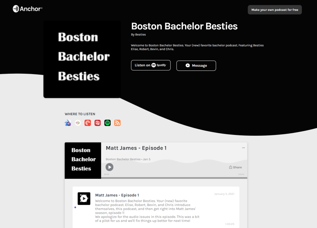 We’re doing a podcast! Boston Bachelor Besties! BeeBeeBee’s? Bébés? (Moira Rose Schitt’s Creek reference there) And this is the first episode! If you like listening to recaps and fun commentary this is for you. And if you’d rather read this blog, those recaps will continue to happen. It’s a beginning, budding, burgeoning (see what I did there?) podcast, so come along as it wobbles on it’s first spindly legs, and give it a listen!