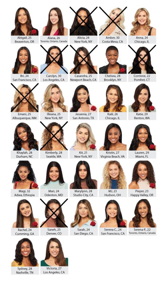 Heading into next week, these are the ladies that are sticking around and for sure have roses: Abigail, Bri, Chelsea, Jessenia, Katie (vibrator girl), Kit, Lauren, Magi, Pieper, Rachel, Sarah and Serena C. We will see who gets kicked off next week and find out what caused the fainting spell on Sarah.