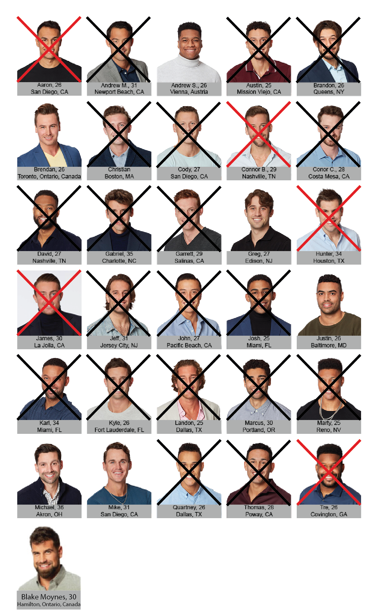Blake Moynes brought out a boombox playing Laine Hardy’s “Memorize You” on the speakers for Katie. This move earned him a hot make-out session. Justin got the rose on a one-on-one wedding date. Moving fast. Connor B. the cat was sent home on a one-on-one date that was actually a double date with Kaitlyn and fiancé Jason. Connor B. received the most tear-filled good-bye from the group of men. Hunter was the target at the drag queen tea-spilling group date. And no one on the group date got the rose.