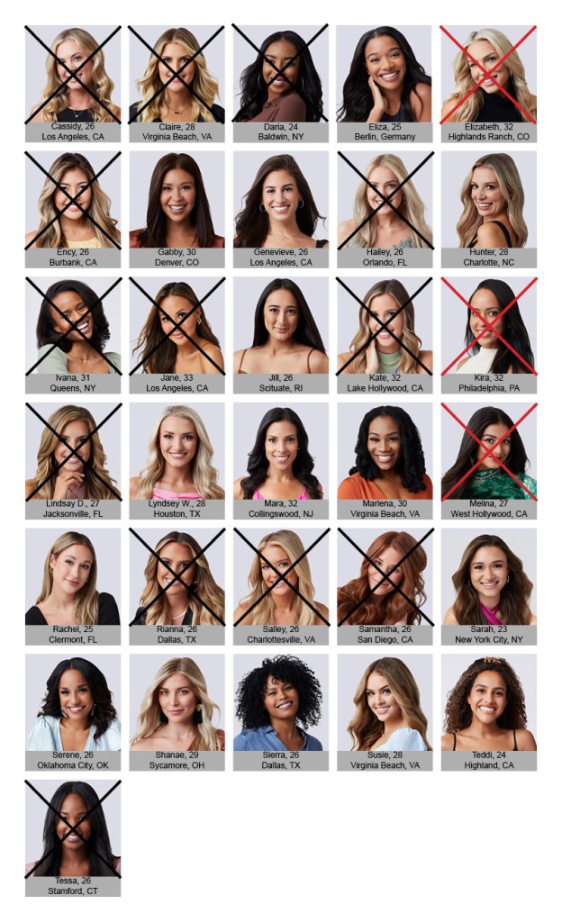 Who got kicked off: Elizabeth, Kira, and Melina were sent home this week at the rose ceremony.