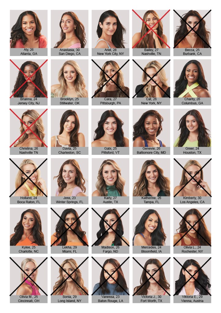 Who got kicked off: Bailey, Brianna and Christina went home this week. Bailey went home on a group date. Brianna self-eliminated at the pool party. And Christina went home because Brianna said she was a disruptor.