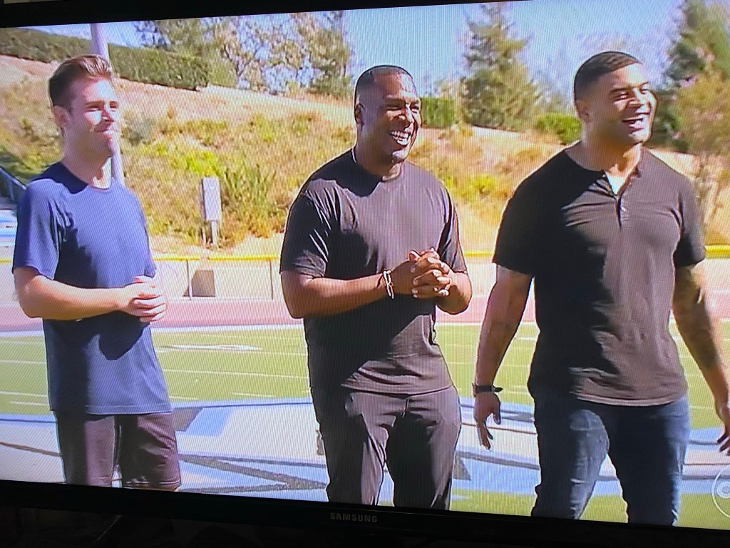 This was the fifth annual Bachelor Bowl starting with JoJo’s season and going through Clayton’s season. It was full tackle football. Woot! Former LA Chargers players Shawne Merriman and Antonio Gates came out to host the date and warm up the ladies for their game. Hannah Storm adn Jesse Palmer were the game commentators. Christina was coming out swinging and told us she has done crossfit since forever. The ladies were split into teams and the losing team was told they had to go back home. The teams were the Blue Team (Ariel, Bailey, Brooklyn, Christina, Charity, Kat and Kylee) called the Ball-Zachs and the Yellow Team (Mercedes, Genevie, Greer, Gabi,Jess, Brianna, Anastasia and Davia) called the Shall-Crushers. As named by the Bachelor Interns. The Blue Team the Ball-Zachs proved to be victorious 14-7.